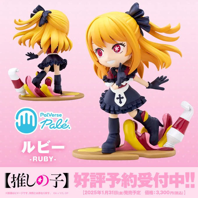 This is a non-scale figure of Ruby Hoshino from the anime series Oshi no Ko. It belongs to the PalVerse Pale figure series by Bushiroad Creative, which is known for its chibi designs inspired by Western cartoons. Ruby is posed dynamically in her signature idol outfit, standing on a painter's palette-themed base with vibrant paint splashes.
